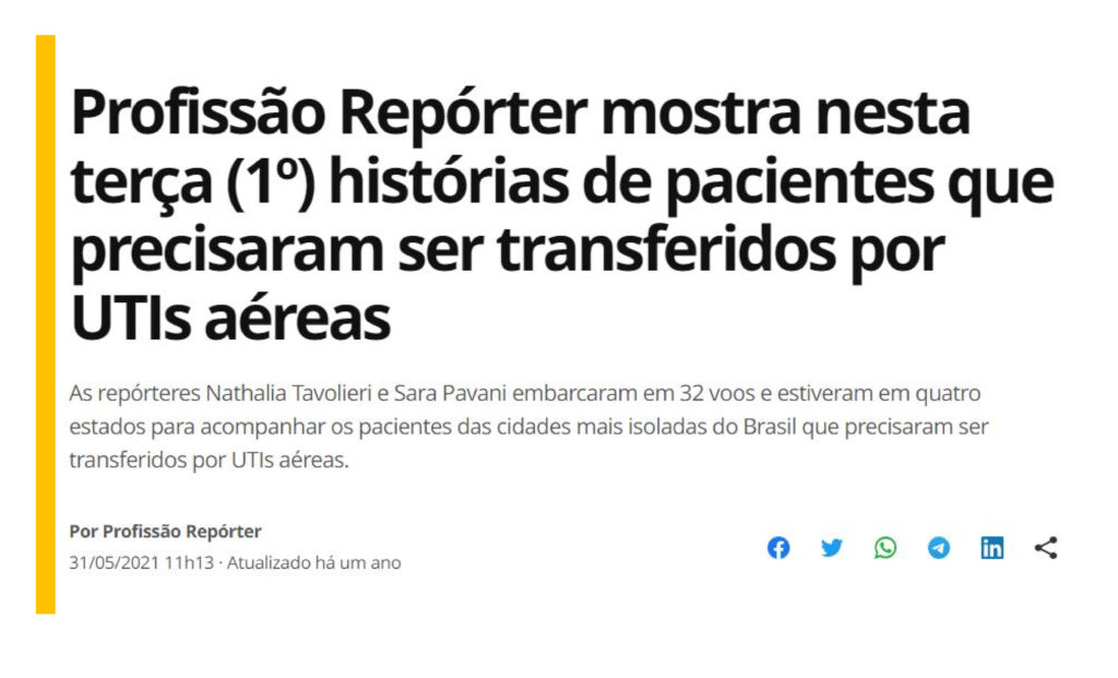 Profissão Repórter mostra histórias de pacientes que precisaram ser transferidos por UTIs aéreas